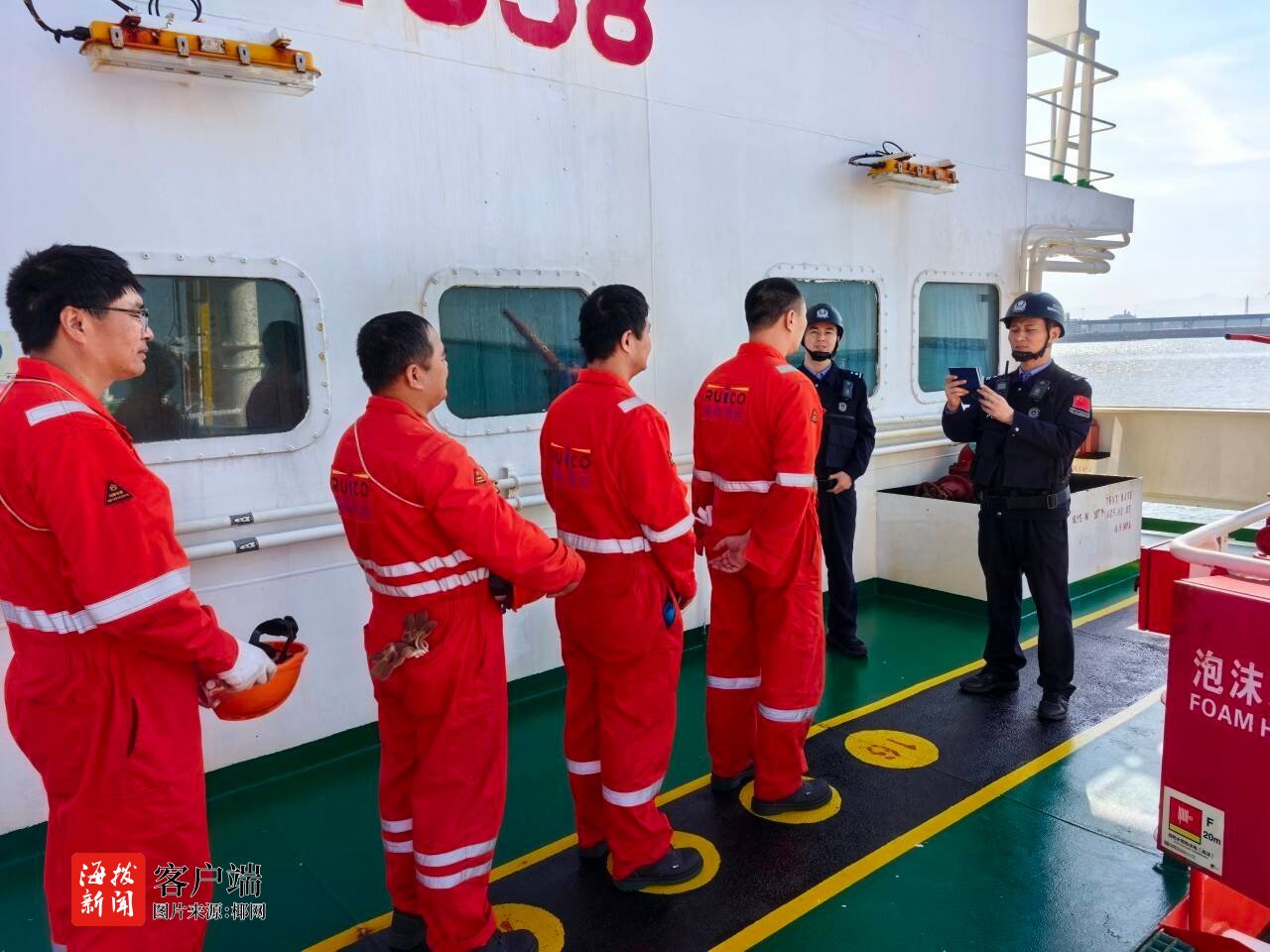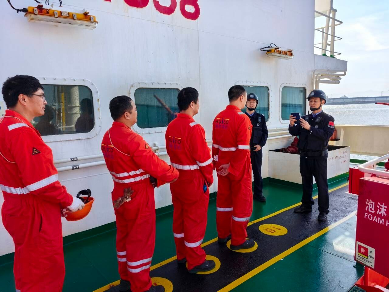 “请大家拿好证件,排好队。”八所边检站民警提前穿戴好装备,通过登轮检查,迅速完成船员人证对照,加快办理船舶、人员出入境手续。由于到港前已提前审核船舶申报单据和船员证件资料,船舶靠港后,边检民警第一时间完成信息核对与查验,保障重点化工船舶高效入境。
