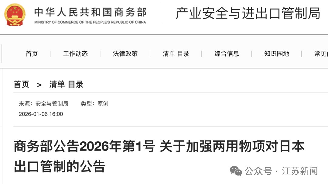 商务部1月6日发布2026年第1号关于加强两用物项对日本出口管制的公告。