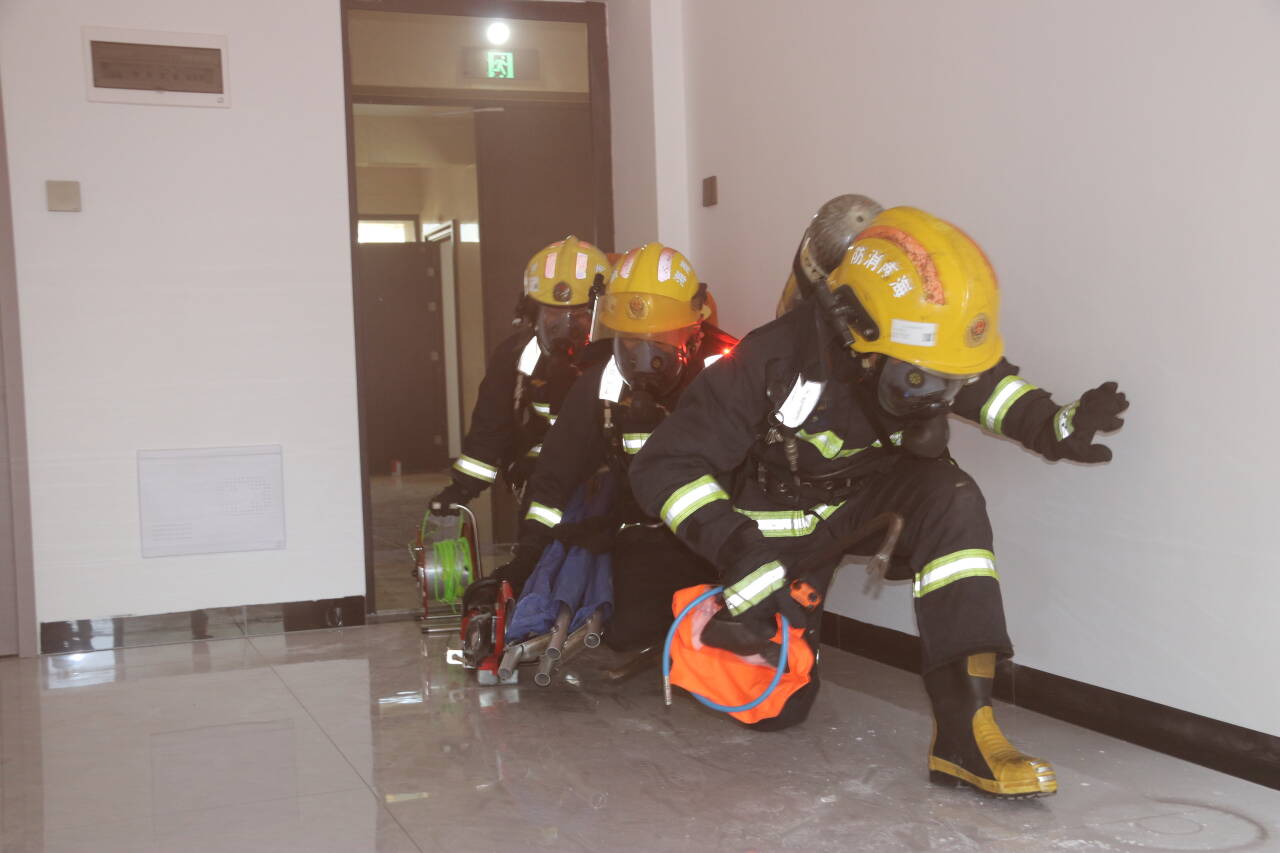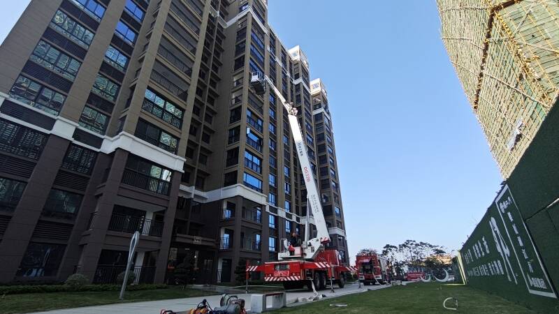 演练模拟小区某单元楼房14楼发生火灾,有人员被困。