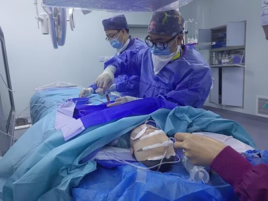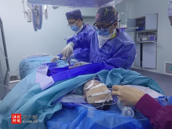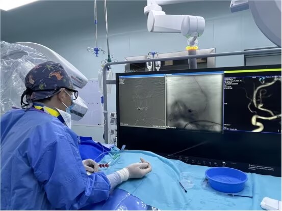 面对这项艰巨的任务,面对宝宝父母的信任,海医一附院神经外科介入团队迎难而上。经过多学科讨论和反复研究,最终决定采用神经介入微创手术——这是当时最可行却也最具挑战的方案。但这项技术对医生的操作精度提出了极致要求,且目前没有专为婴幼儿设计的手术耗材,只能选择管径最小的成人耗材应对手术需求。