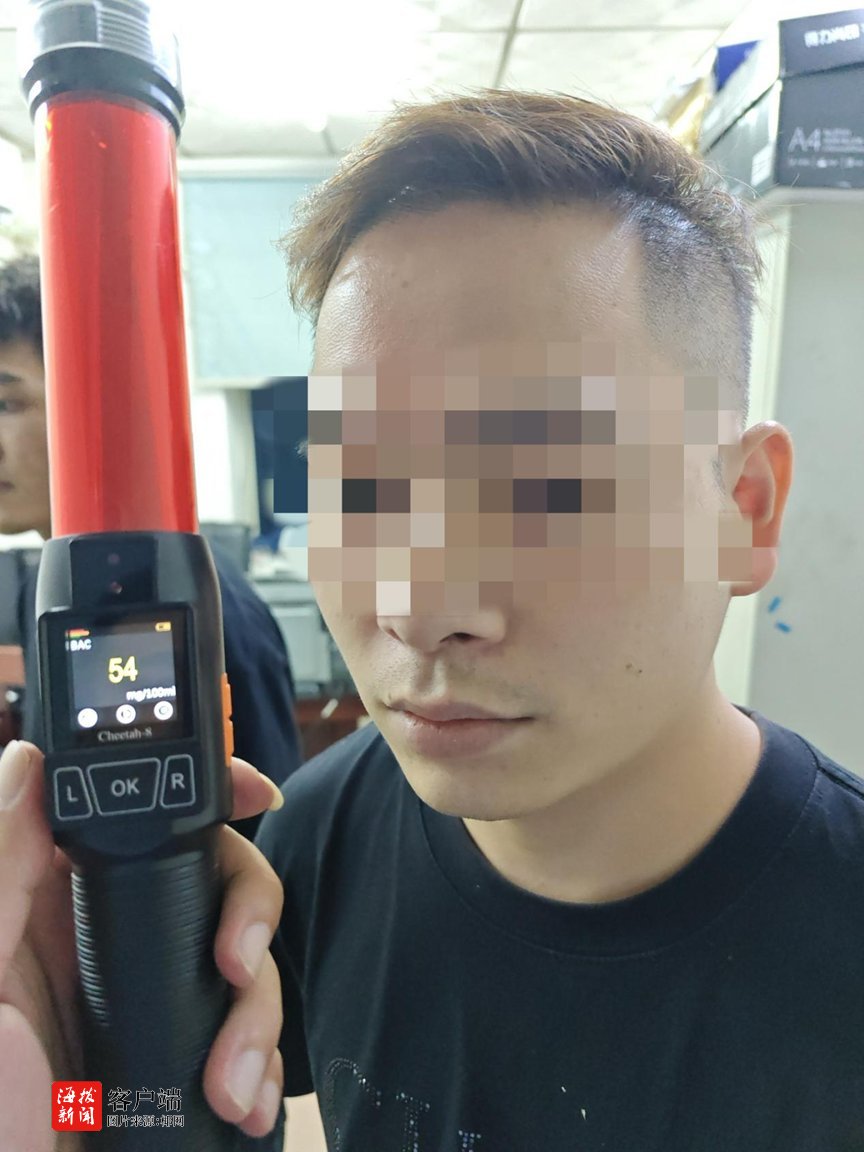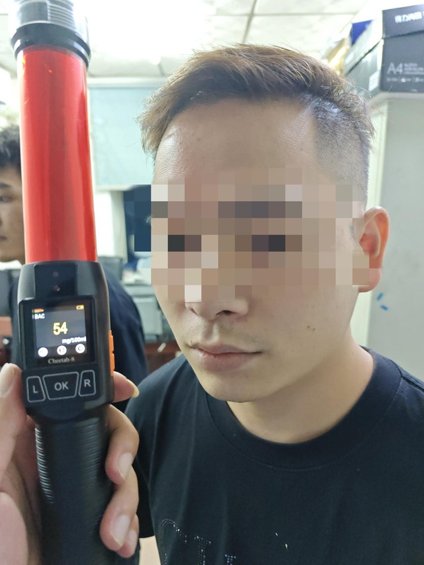 执勤民警接警后迅速抵达现场,勘查中发现符某港面色泛红、身上有明显酒气。现场呼气式酒精检测显示,其酒精含量为50mg/100ml,达酒后驾车标准。处理期间,被追尾车辆驾驶员梁某敏神情紧张、刻意与民警保持距离,异于普通事故当事人的正常反应,引起民警警惕。