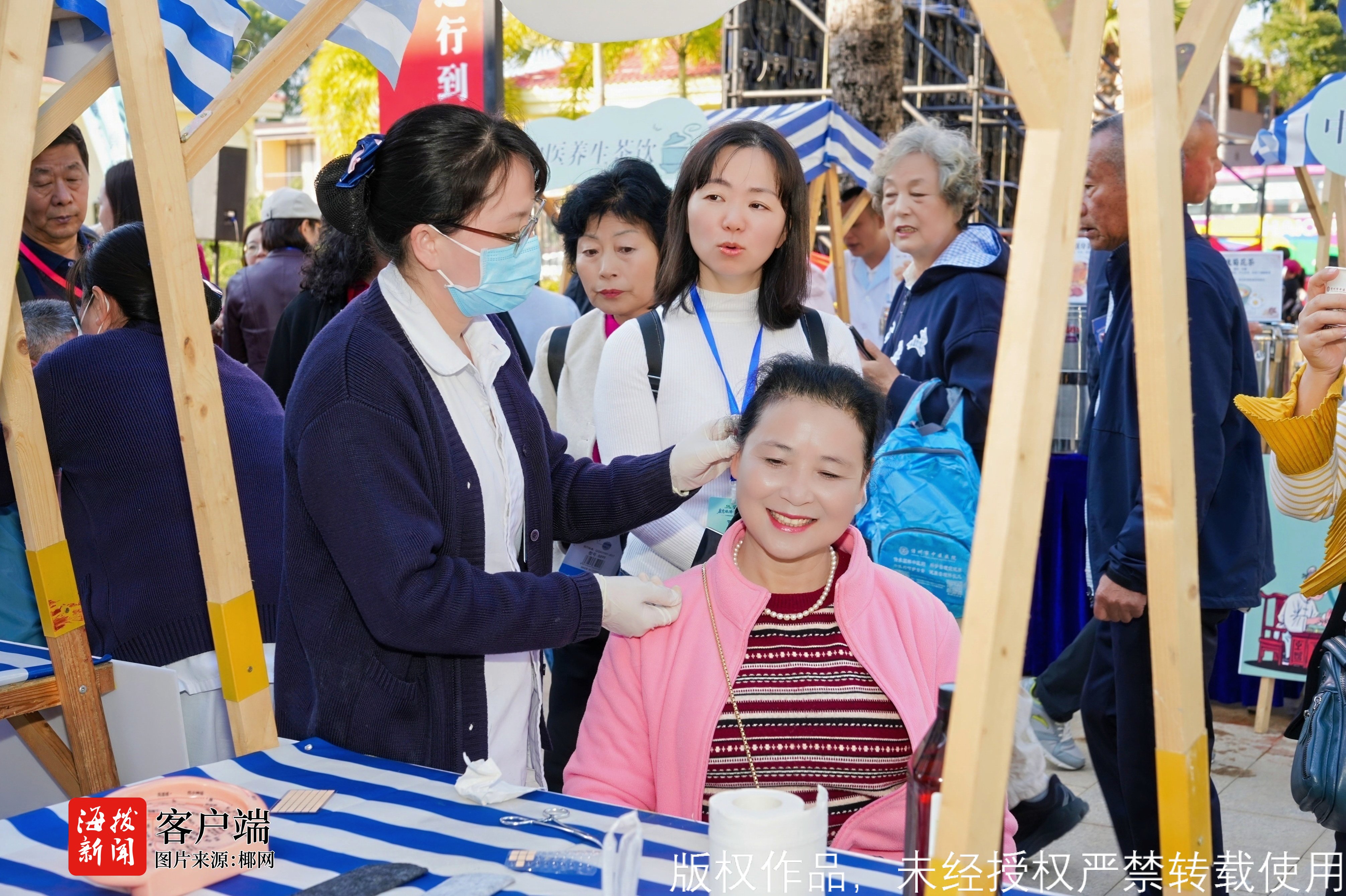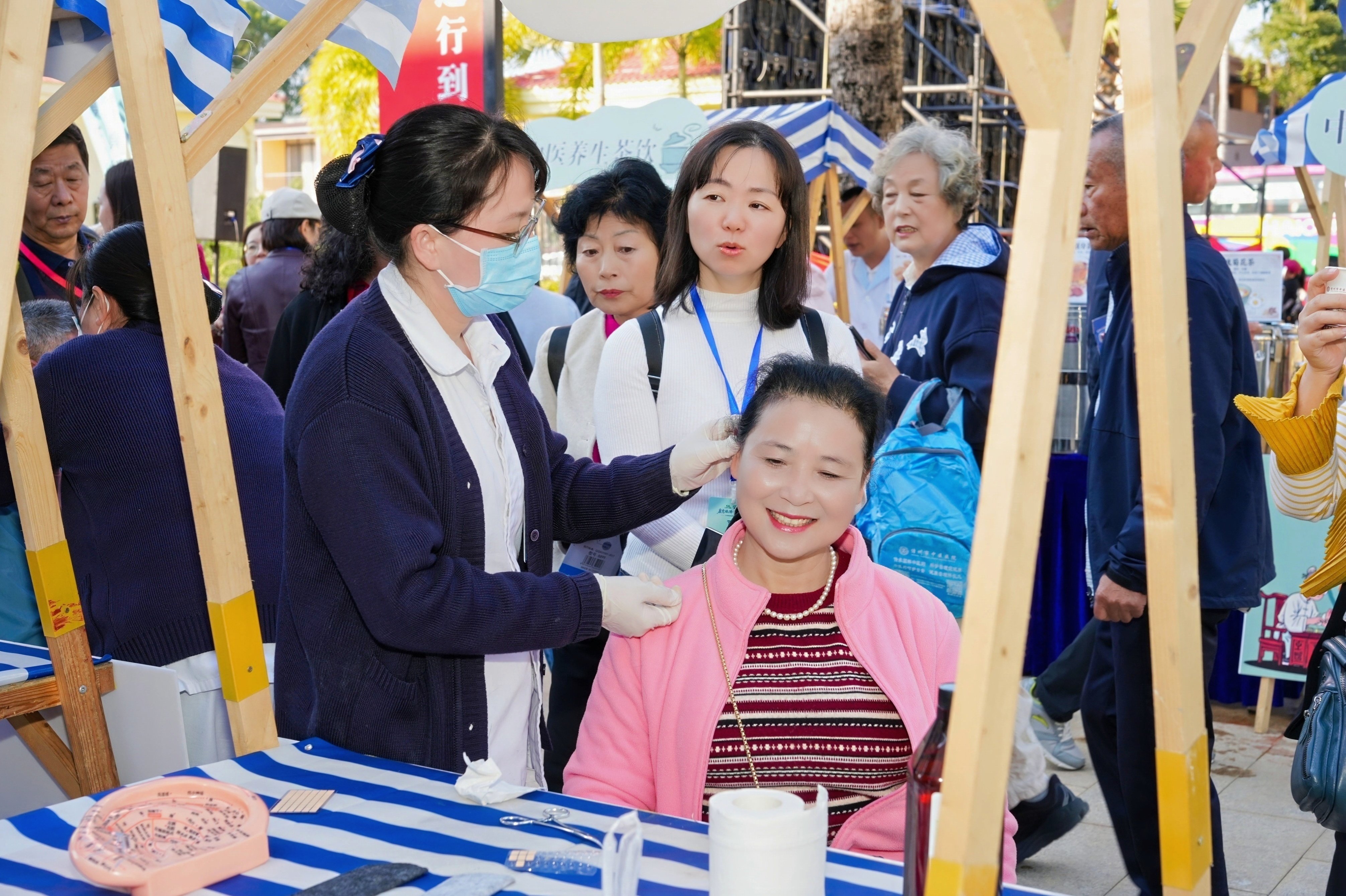 现场还有两大主题市集同步开放,成为市民游客的“打卡热点”。非遗市集上,非遗传承人现场展示藤编、苗绣等非遗技艺,市民游客亲手体验“指尖非遗”的魅力;三色饭色泽鲜亮、客家擂茶香气醇厚,搭配木薯饼的软糯,特色美食让味蕾与文化的碰撞尽显民俗魅力。中医康养市集则化身“移动养生馆”,拔罐、刮痧、艾灸等传统养生项目免费体验,专业医师现场提供健康咨询,让市民游客亲身体验中医文化的同时,沉浸式解锁温泉康养的多元玩法。