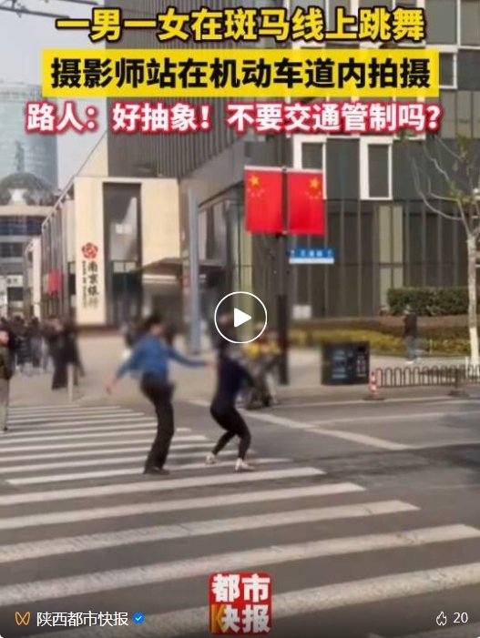 2026年1月8日12时50分许,江某(女,30岁)、吴某(男,35岁)、吴某某(男,25岁)以及漆某(男,48岁)为拍摄视频,由江某、吴某在四川北路天潼路路口斑马线上滞留跳舞,漆某、吴某某在道路上进行拍摄,对该路口正常通行秩序造成影响。目前,警方已依法对上述4人作出行政处罚。