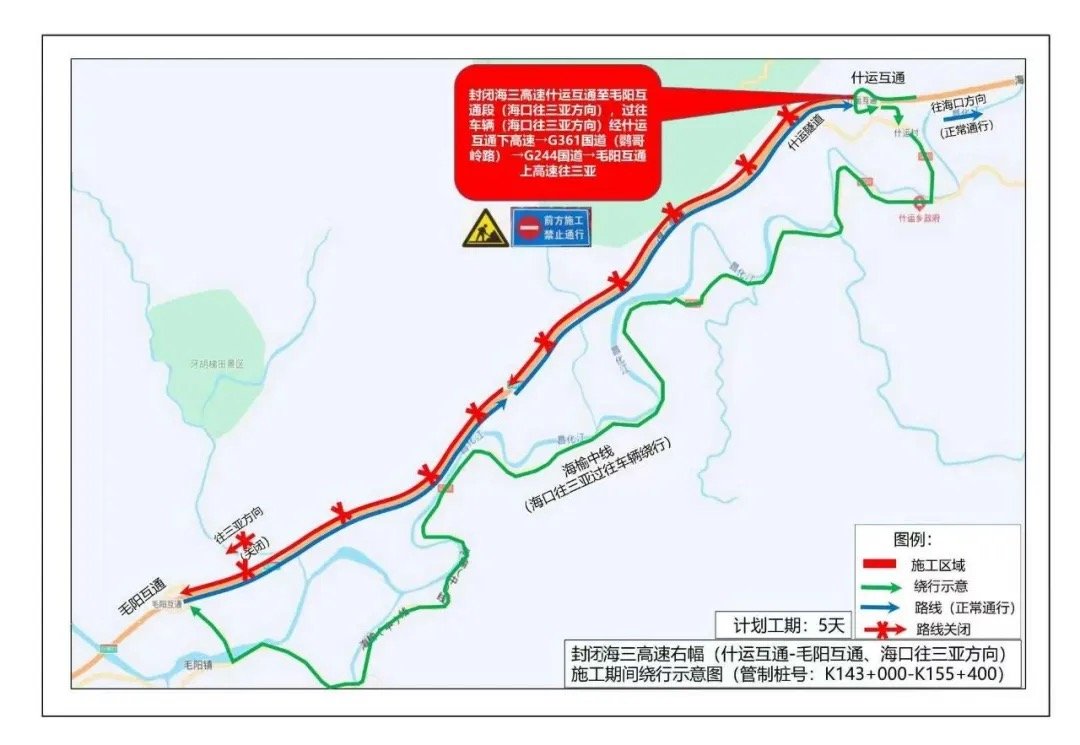(一)2026年1月12日至2026年1月16日,封闭G9811海三高速K143+000至K155+400右幅(海口往三亚方向)车道,由海口往三亚方向的车辆从什运互通下高速→G361陵昌线(鹦哥岭路)→G224海榆中线→毛阳互通重新上高速往三亚方向。