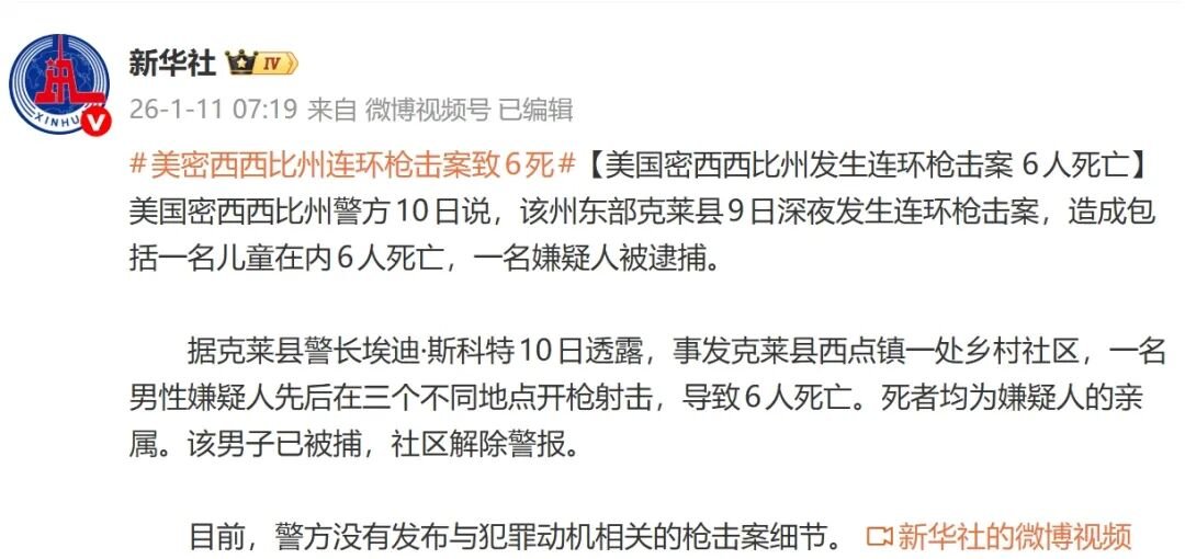1月11日,@新华社:美国密西西比州警方10日说,该州东部克莱县9日深夜发生连环枪击案,造成包括一名儿童在内6人死亡,一名嫌疑人被逮捕。