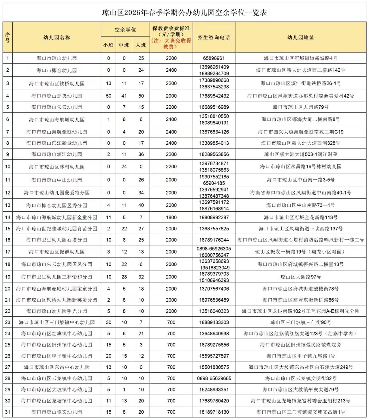 商报全媒体讯(椰网/海拔新闻记者 许文玉)1月11日,国际旅游岛商报记者从琼山区教育局获悉,为提升公共服务供给能力、满足幼儿入园需求,该局正式公布了31所公办幼儿园2026年春季学期招生空余学位情况。同时,因琼山区公办幼儿园学位总体紧张,请有插班需求的家长务必提前向意向幼儿园电话咨询详情。