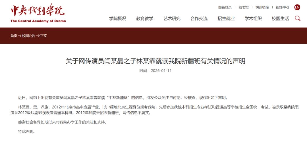 1月11日,中央戏剧学院网站发布关于网传演员闫某晶之子林某霏就读我院新疆班有关情况的声明: