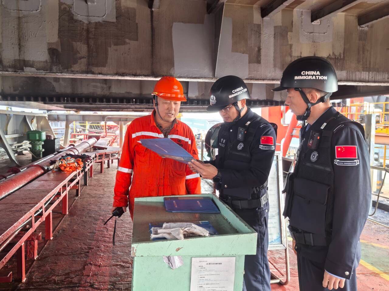 9时30分,执勤民警已抵达海南八所口岸危险品码头,为中国籍“海鑫油619”轮办理船员离船换班手续。他们严格核对8名船员证件,细致完成人证对照、信息录入等流程,以专业高效的服务确保换班作业安全有序,完成了节日当天的“第一项任务”。11时,民警转赴八所港码头,对巴拿马籍“金谷”轮开展物资供应检查,重点核验物资清单与实际货物是否一致,从源头防范安全隐患,以“零疏漏”标准筑牢口岸安全防线。16时50分,执勤民警再次前往危险品码头,对“海鑫油619”轮实施人员登离轮检查、船舶离港安全评估及防护设施排查。