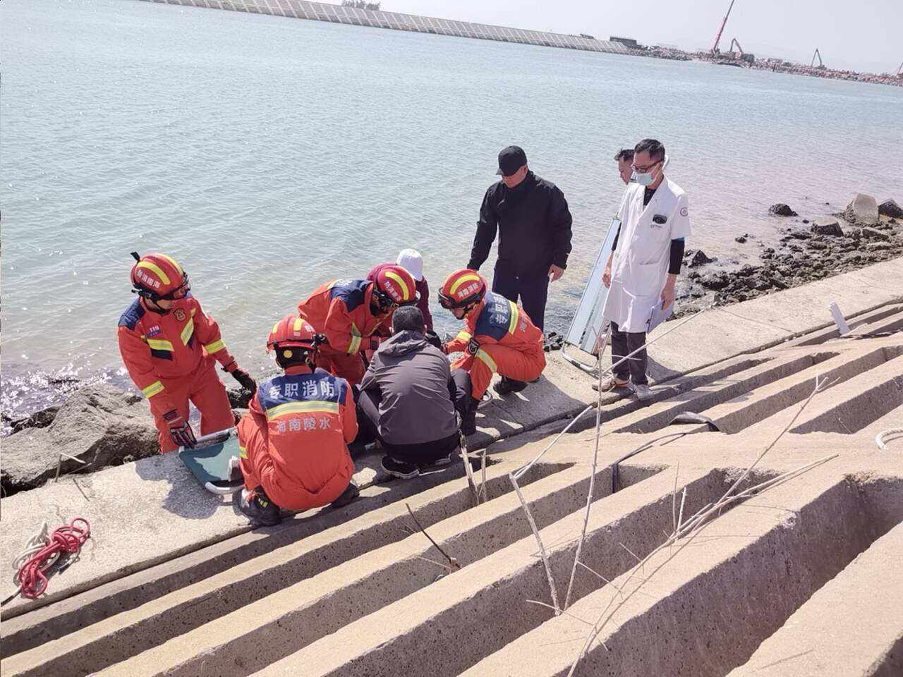 一老人因腰部受伤被困堤坝,陵水消防紧急救援