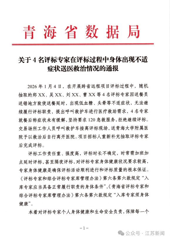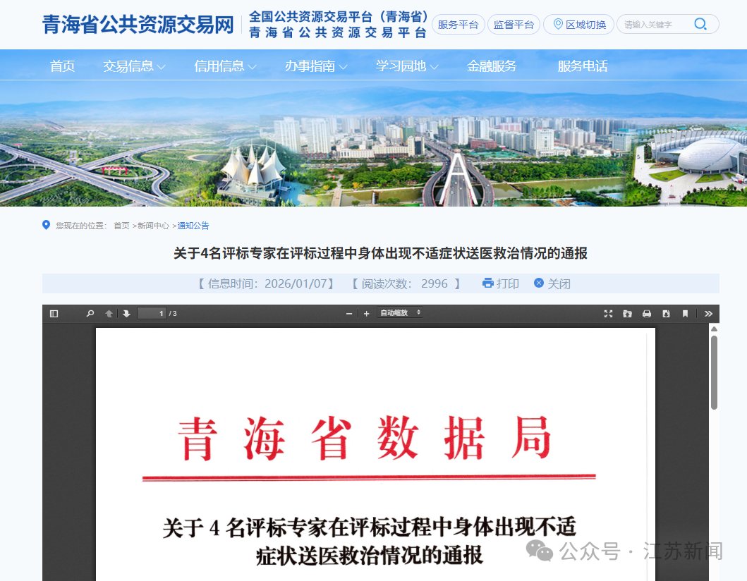 青海省公共资源交易网日前发布《关于4名评标专家在评标过程中身体出现不适症状送医救治情况的通报》: