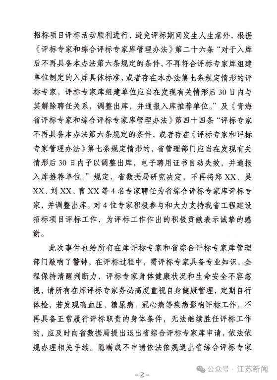 青海官方通报:4名评标专家,解聘并调整出专家库