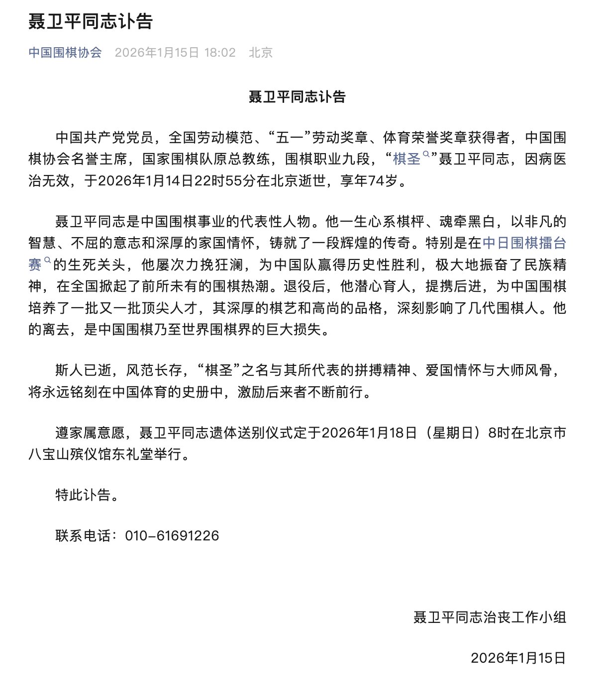 聂卫平治丧工作小组发布讣告:聂卫平遗体送别仪式定于1月18日举行