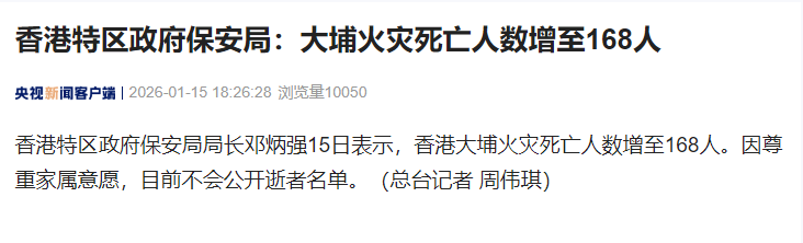 香港特区政府保安局局长邓炳强15日表示,香港大埔火灾死亡人数增至168人。因尊重家属意愿,目前不会公开逝者名单。