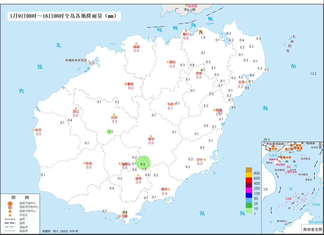 周降雨量:海南岛最大周降水量为保亭县什玲镇6.3毫米;三沙市部分岛礁前期出现暴雨以上量级降水,最大周降雨量为美济礁243.8毫米。