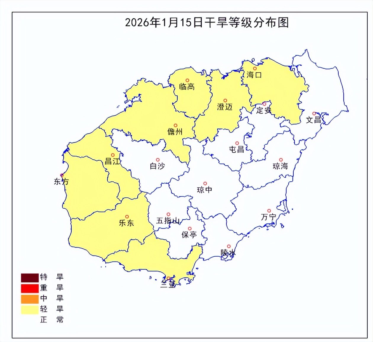 气象干旱情况:截至1月15日,海口、三亚、儋州、临高、澄迈、昌江、乐东和东方等地出现轻度气象干旱,其余市县处于无气象干旱状态。与1月8日相比,海口和三亚由无旱发展为轻旱,其他市县气象干旱状态无变化。