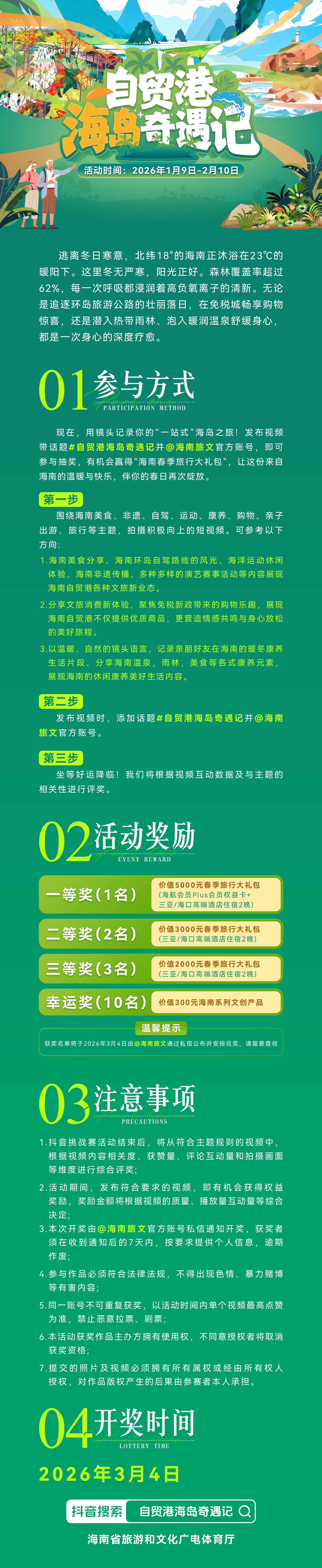 “自贸港海岛奇遇记”短视频征集活动将持续至2026年2月10日。此次活动不仅是展示个人创意与旅行故事的平台,也是向更广泛受众传播海南自贸港建设下文旅产业新气象、新体验的有效窗口。主办方期待广大网友积极参与,共同用镜头发现和记录一个充满活力的海南。