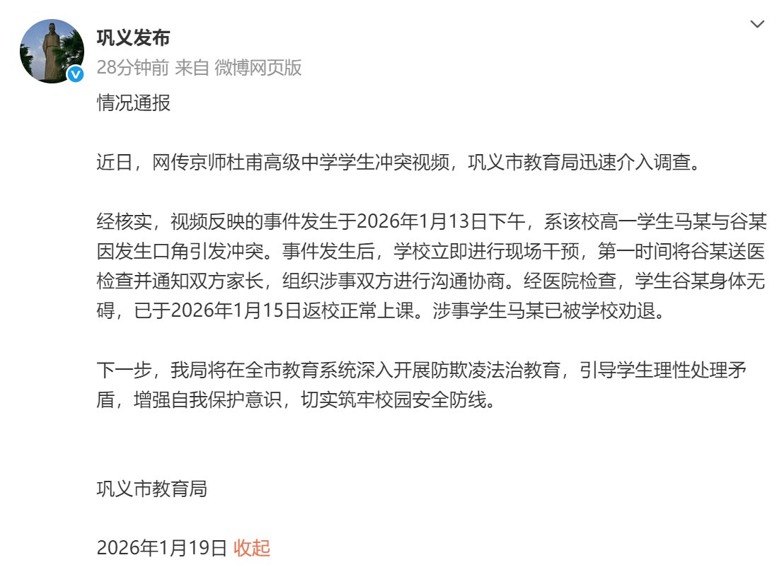 经核实,视频反映的事件发生于2026年1月13日下午,系该校高一学生马某与谷某因发生口角引发冲突。事件发生后,学校立即进行现场干预,第一时间将谷某送医检查并通知双方家长,组织涉事双方进行沟通协商。经医院检查,学生谷某身体无碍,已于2026年1月15日返校正常上课。涉事学生马某已被学校劝退。