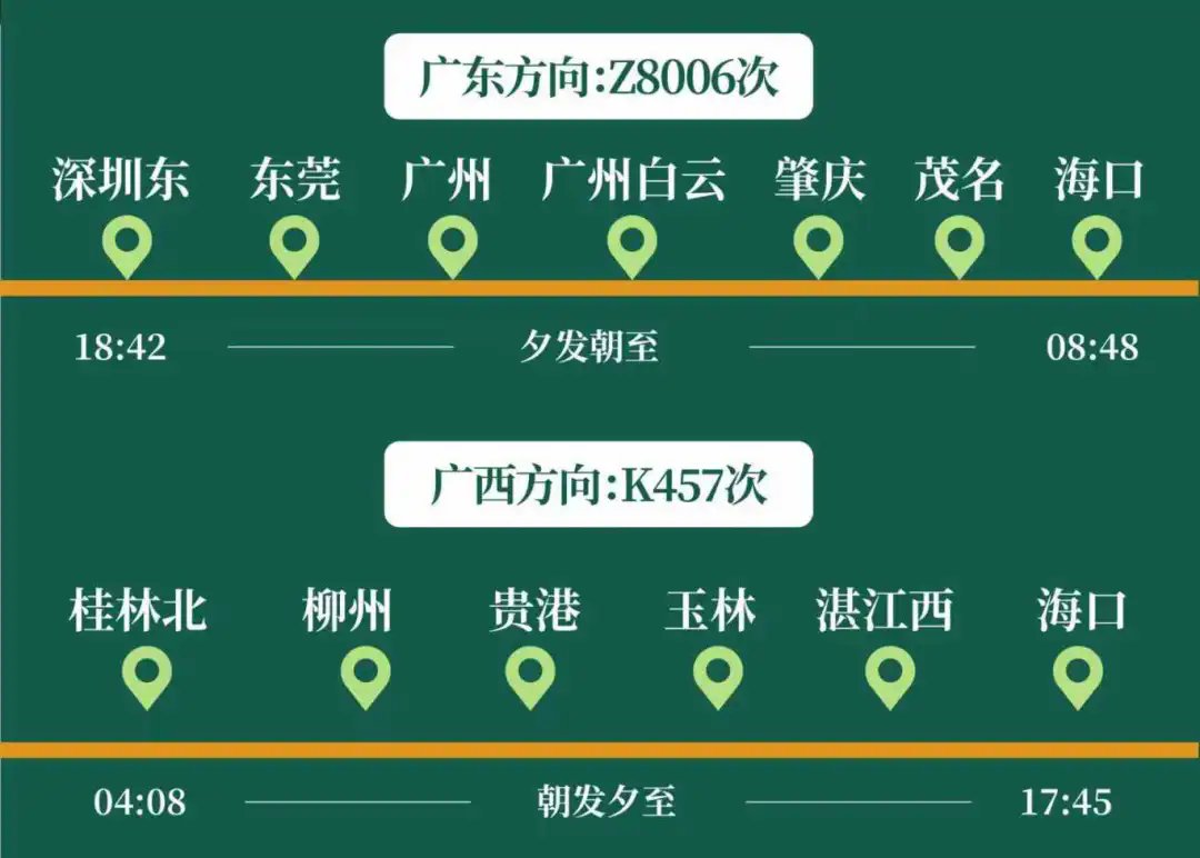 广东方向:Z8006次,串联粤港澳大湾区核心城市。该线路由深圳始发,经停东莞、广州、肇庆、茂名、海口等城市;夕发朝至——18:42从深圳东站出发,第二天上午08:48抵达海口站,最大化利用时间;无需换乘直达海口,卧铺过夜还可以节省一晚住宿费用。