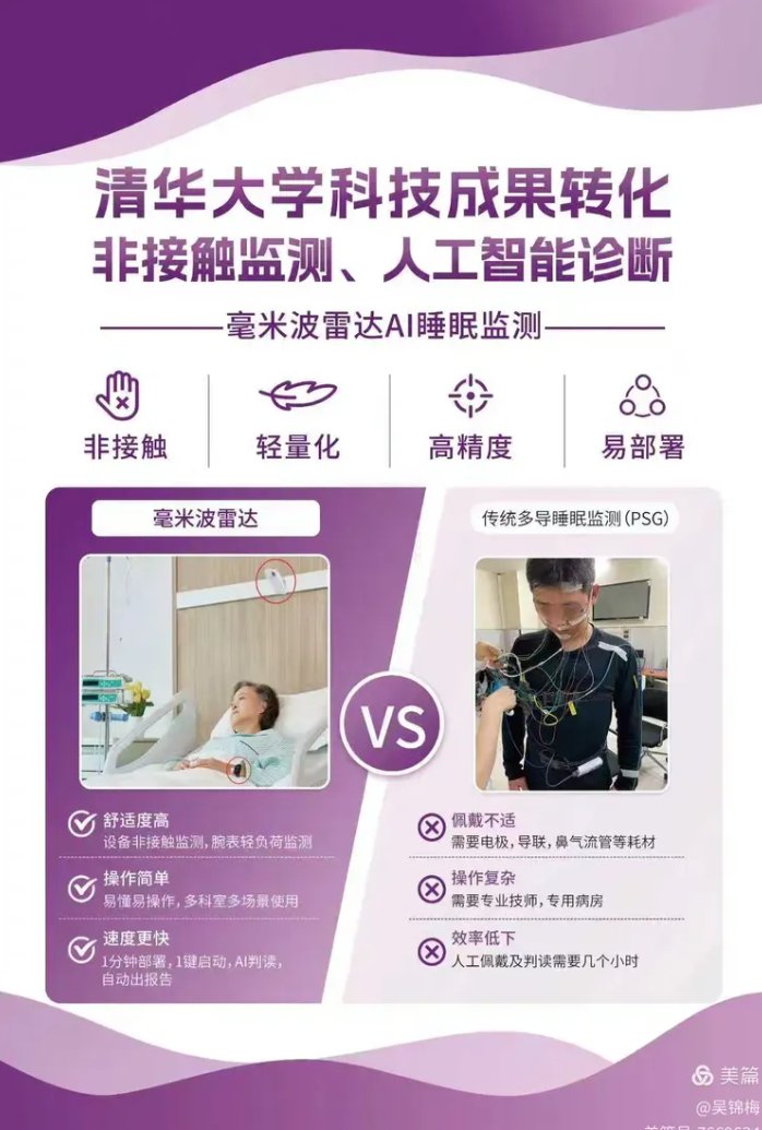 据介绍,毫米波雷达+AI睡眠仪是一款基于毫米波雷达的新型睡眠监测仪。以往睡眠障碍的患者需要进行睡眠呼吸监测时,通常是使用传统的多导睡眠监测仪,多导睡眠监测仪需要在患者的身体粘贴多个电极和导线,给受检者带来不适,更影响患者的正常睡眠。而毫米波雷达+AI睡眠仪是以无需导联的监测方式进行监测,具有监测精准、非接触、无感监测、不影响睡眠的优势,受检者只需要在医院睡一晚,佩戴专用的腕式血氧仪,便可以监测整晚的睡眠状态。