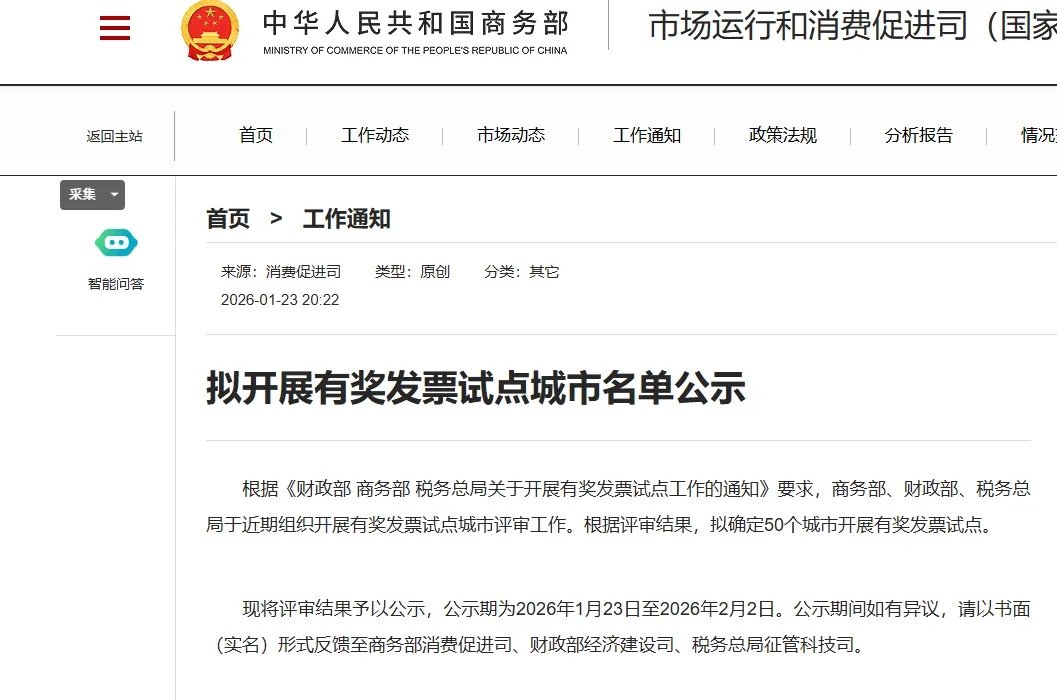 根据《财政部 商务部 税务总局关于开展有奖发票试点工作的通知》要求,商务部、财政部、税务总局于近期组织开展有奖发票试点城市评审工作。根据评审结果,拟确定50个城市开展有奖发票试点。现将评审结果予以公示,公示期为2026年1月23日至2026年2月2日。