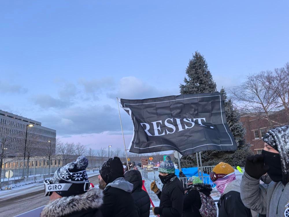 1月21日,人们在美国明尼苏达州明尼阿波利斯的惠普尔联邦大楼外抗议。美国移民与海关执法局等多个联邦机构的当地办事处都设在该大楼内。新华社发