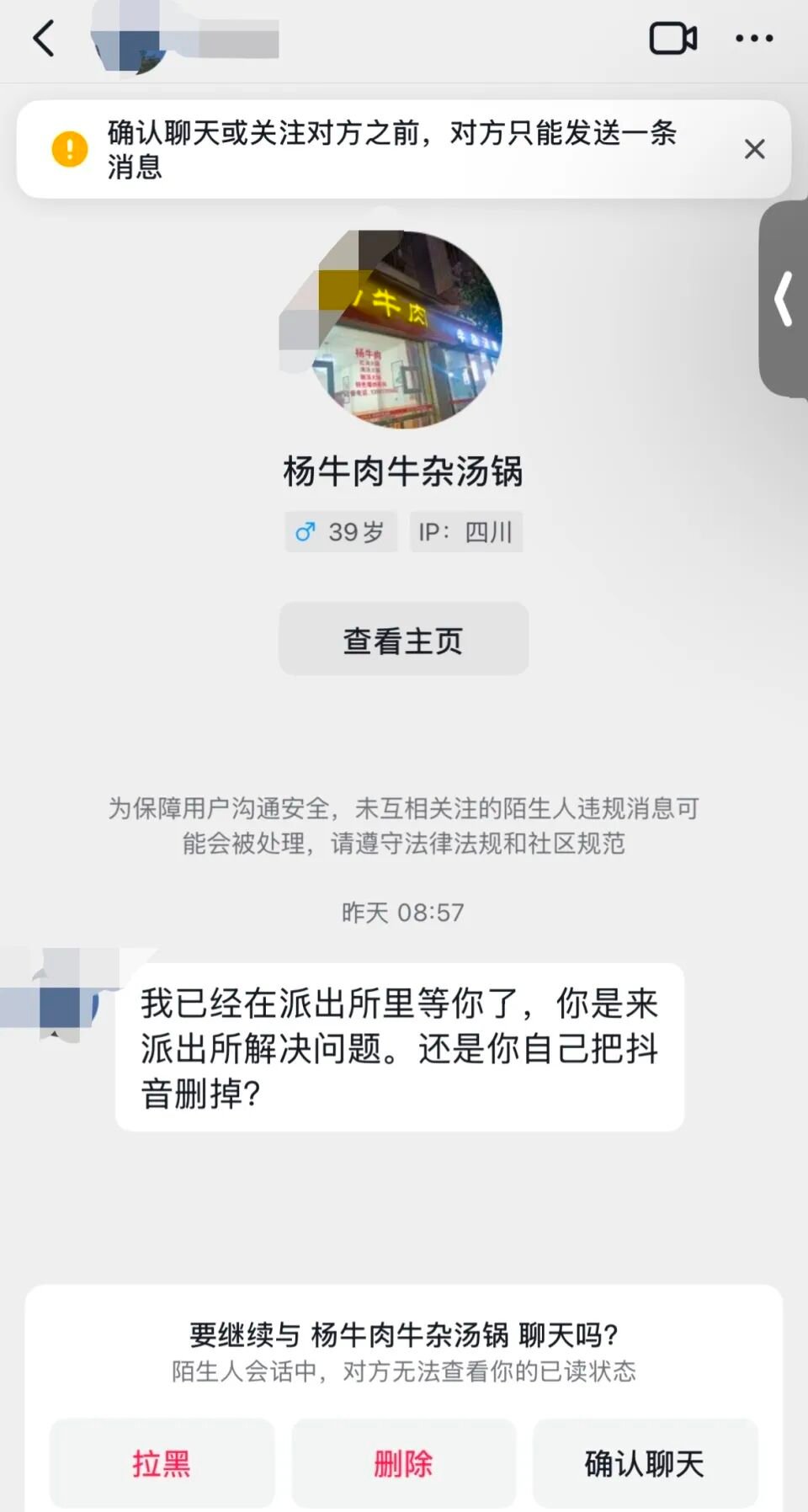 邢先生告诉记者,该视频发到网上后,曾收到多条威胁言论,其中还有来自涉事商家头像的私信称:“我已经在派出所里等你了,你是来派出所解决问题,还是你自己把视频删掉。”邢先生表示,对此他并未理会,但商家后续的态度确实恶劣。