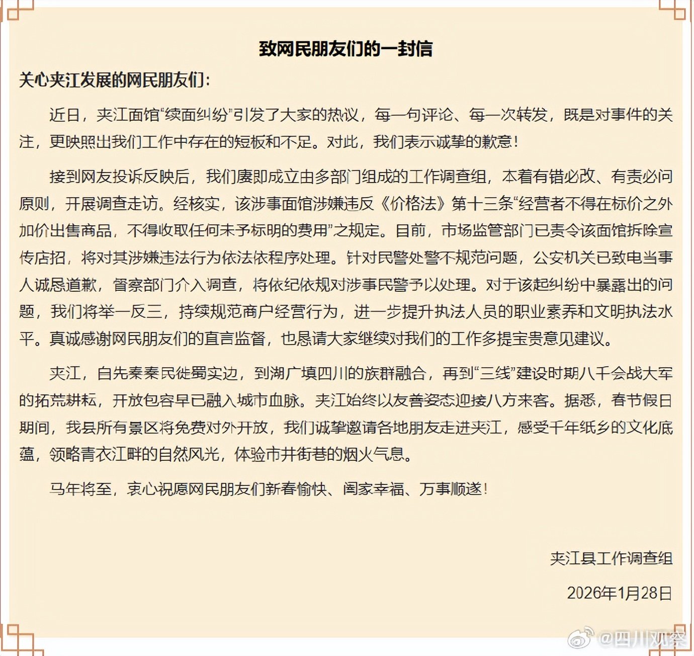 1月28日,四川夹江县工作调查组发布《致网民朋友们的一封信》: