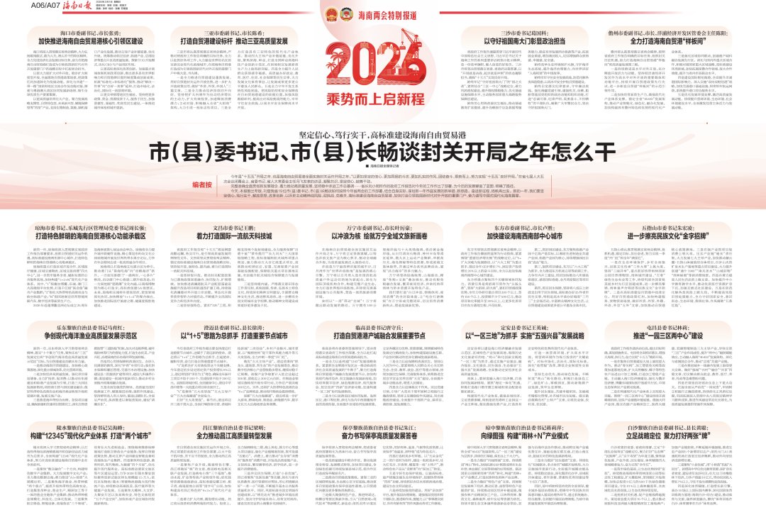 今天,海南日报推出专版,刊登我省19位市(县)委书记、市(县)长畅谈如何按照今年省两会的工作部署,结合自身实际,谋划新一年市县发展的新举措、新思路。奋进新征程,扬帆再出发。新的一年,我们要坚定信心、笃行实干,解放思想、改革创新,以历史主动精神战风险、迎挑战、克难关,高标准建设海南自由贸易港,加快打造引领我国新时代对外开放的重要门户,奋力谱写中国式现代化海南篇章。