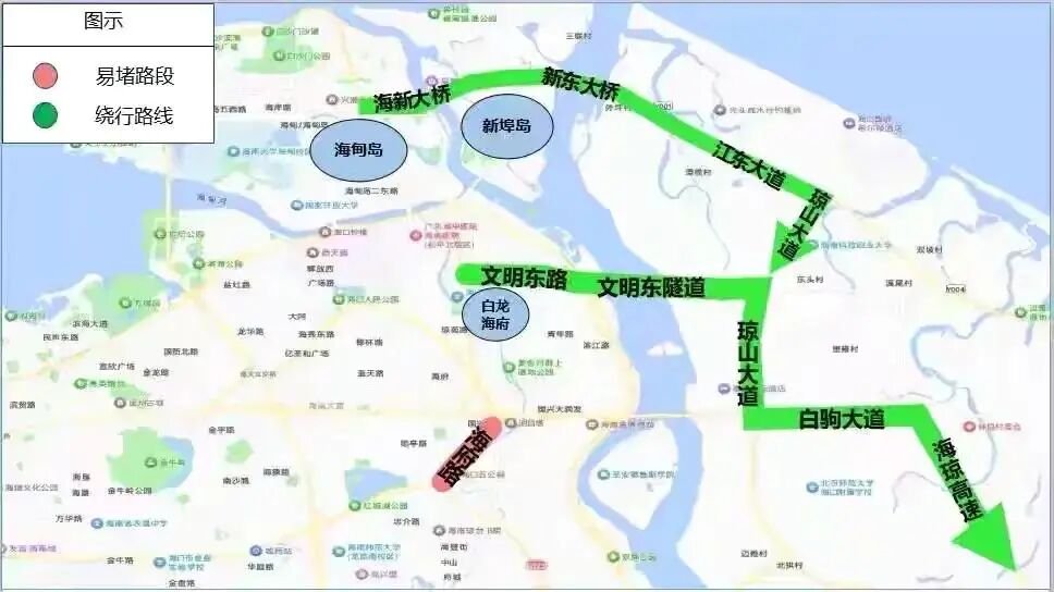 海甸岛、新埠岛及城东片区:文明东隧道/新东大桥→琼山大道→白驹大道出城。