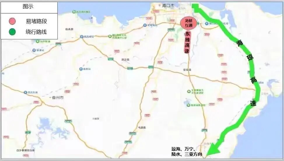 避开G98龙桥互通瓶颈:2月14日下午前往琼海、万宁、陵水、三亚方向的车辆,推荐选择海琼高速,避开龙桥互通匝道并流的拥堵点。