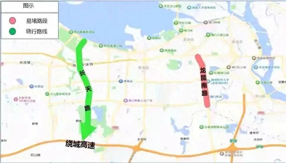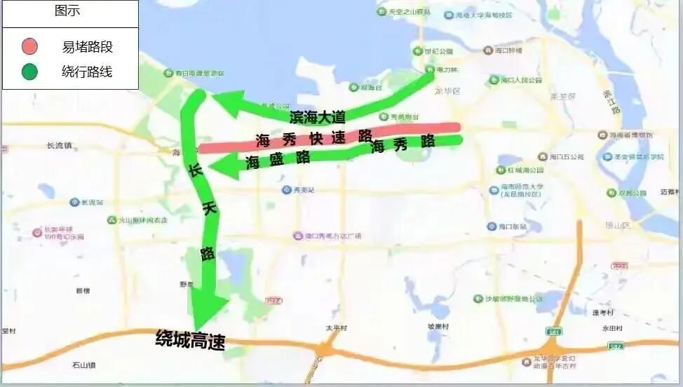避开海秀快速路拥堵:预计2月14日下班与出城车流叠加,金垦、永万等匝道段双向拥堵严重。建议改走滨海大道,或选择海秀路、海盛路→长天路分流。