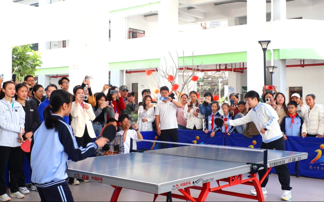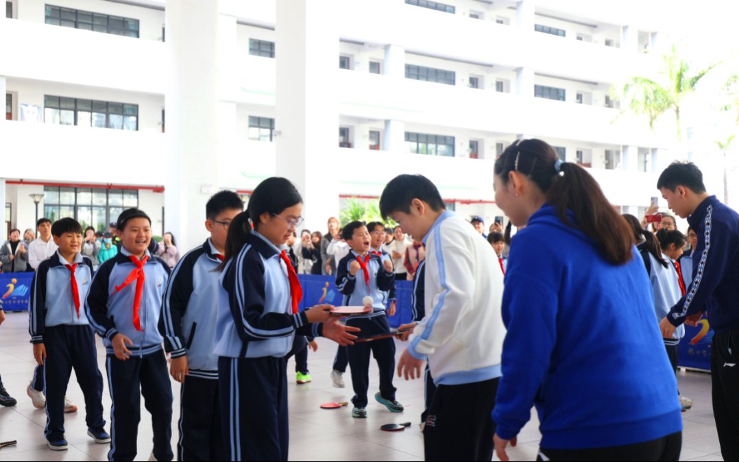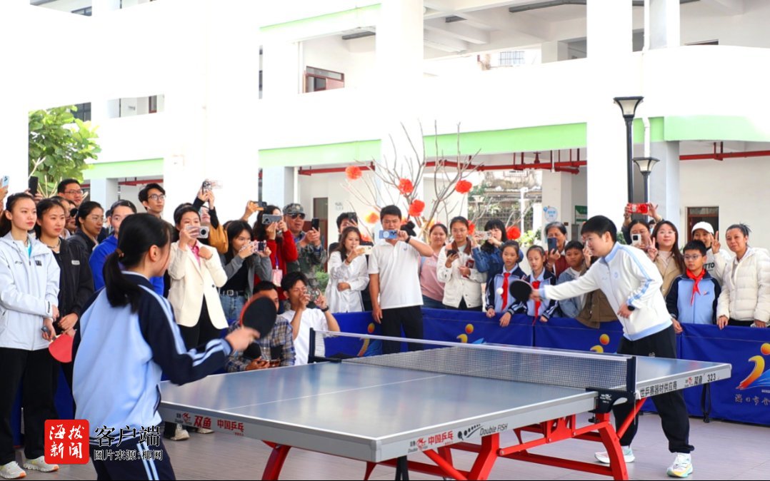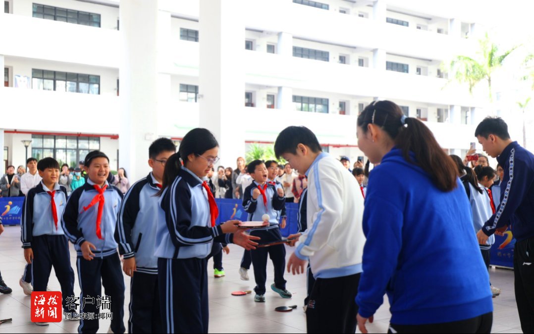 在人大附中海口实验学校,王楚钦等国手与师生们进行趣味互动和轻松愉快的友谊赛,让冠军与乒乓球爱好者零距离接触,生动展现了“榜样就在身边”的感染力。