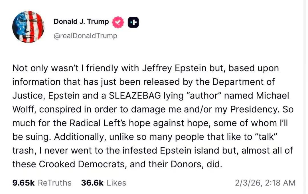 另据新华社消息,美国总统特朗普2月2日在社交媒体上发文,再次否认与美国已故富商爱泼斯坦的案件有关联,称从未去过爱泼斯坦的岛屿。