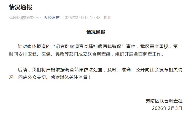 2月3日上午,媒体报道我市存在精神病院违规收治患者、涉嫌套取医保资金等问题后,我市高度重视,立即成立工作专班,在全市开展起底式排查调查,一旦核实相关问题将依法从严从速处理。