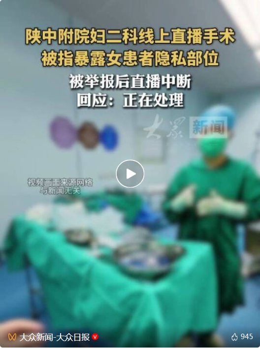 据现代快报报道,2月2日,多名网友在社交平台曝光,称陕西中医药大学附属医院妇二科在网络平台直播做手术,画面中直接出现女性患者隐私部位,多名网友举报后,直播中断。2月3日涉事医院回应称,已经关注到此事,目前正在处理中。