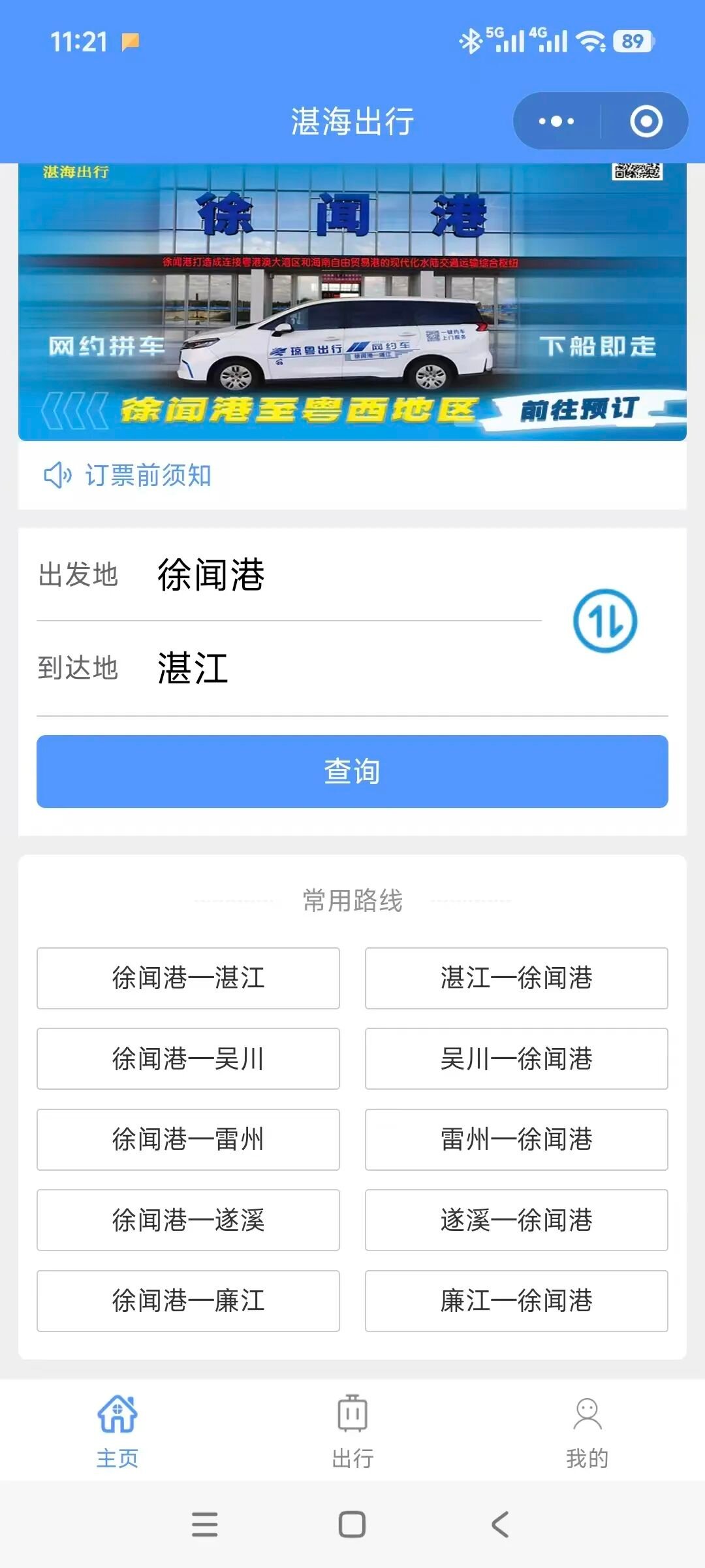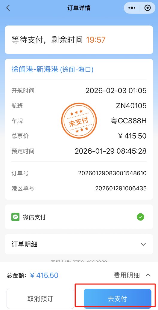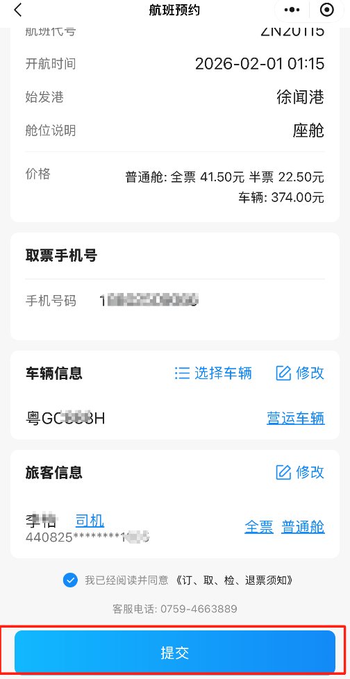 为确保行程顺利,请至少于出发前2小时,通过官方渠道“徐闻港”微信服务号,完成“船票+商务车送站”联程套票的预订。