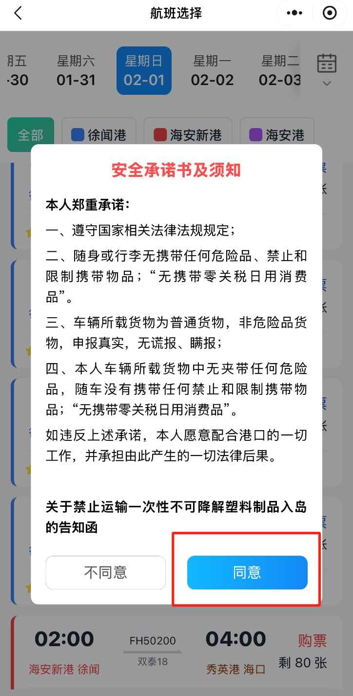 购票时务必搞清楚航线方向,进岛选择航线“徐闻至海口”,始发港可选“徐闻港”或“海安新港”;出岛选择航线“海口至徐闻”,始发港可选“新海港”或“秀英港”,以免购错票。