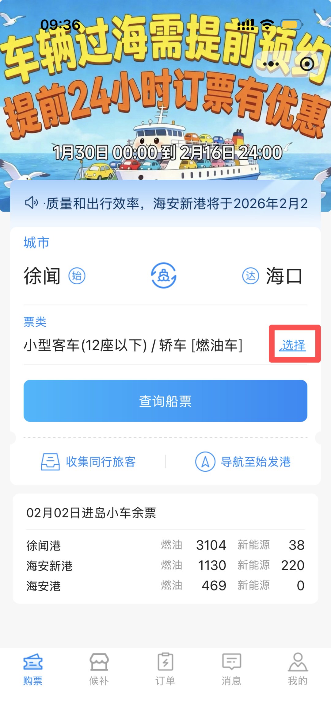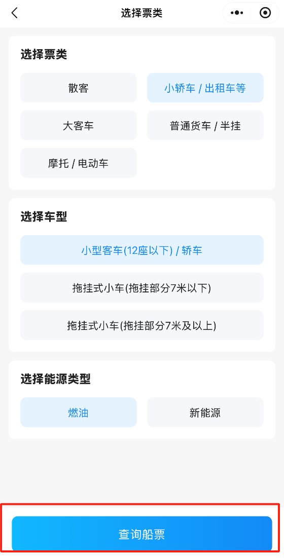 3.选择票类、车型、能源类型,点击“查询船票”。