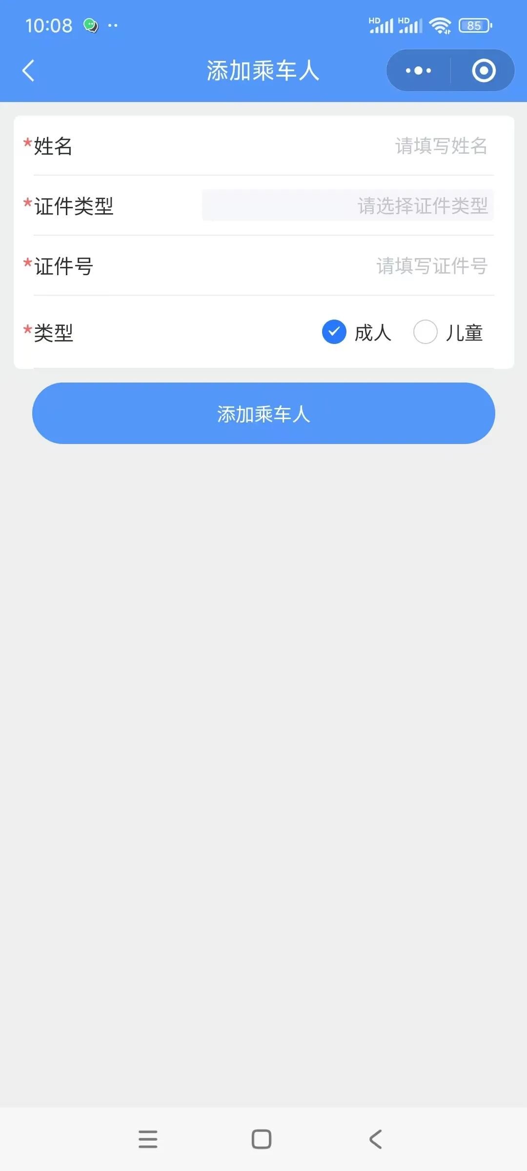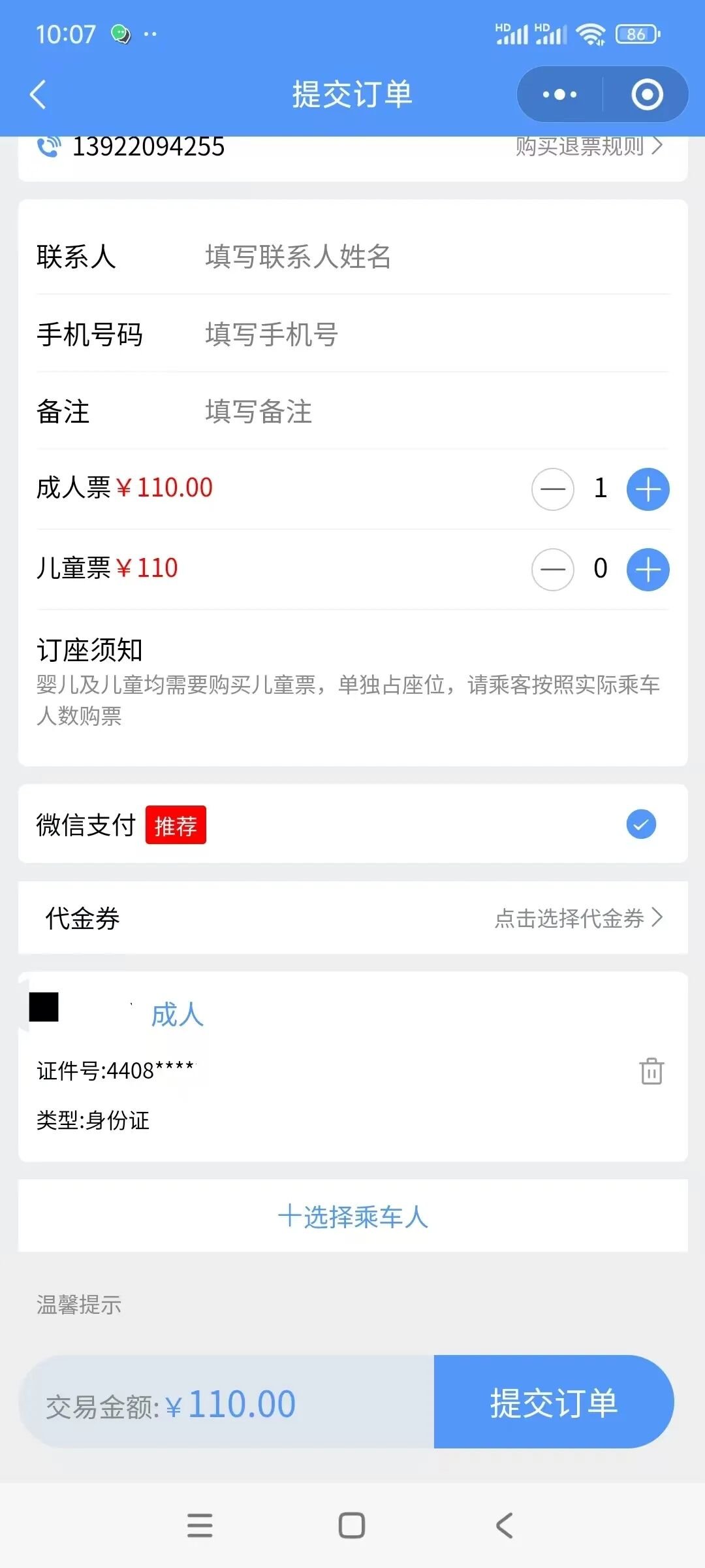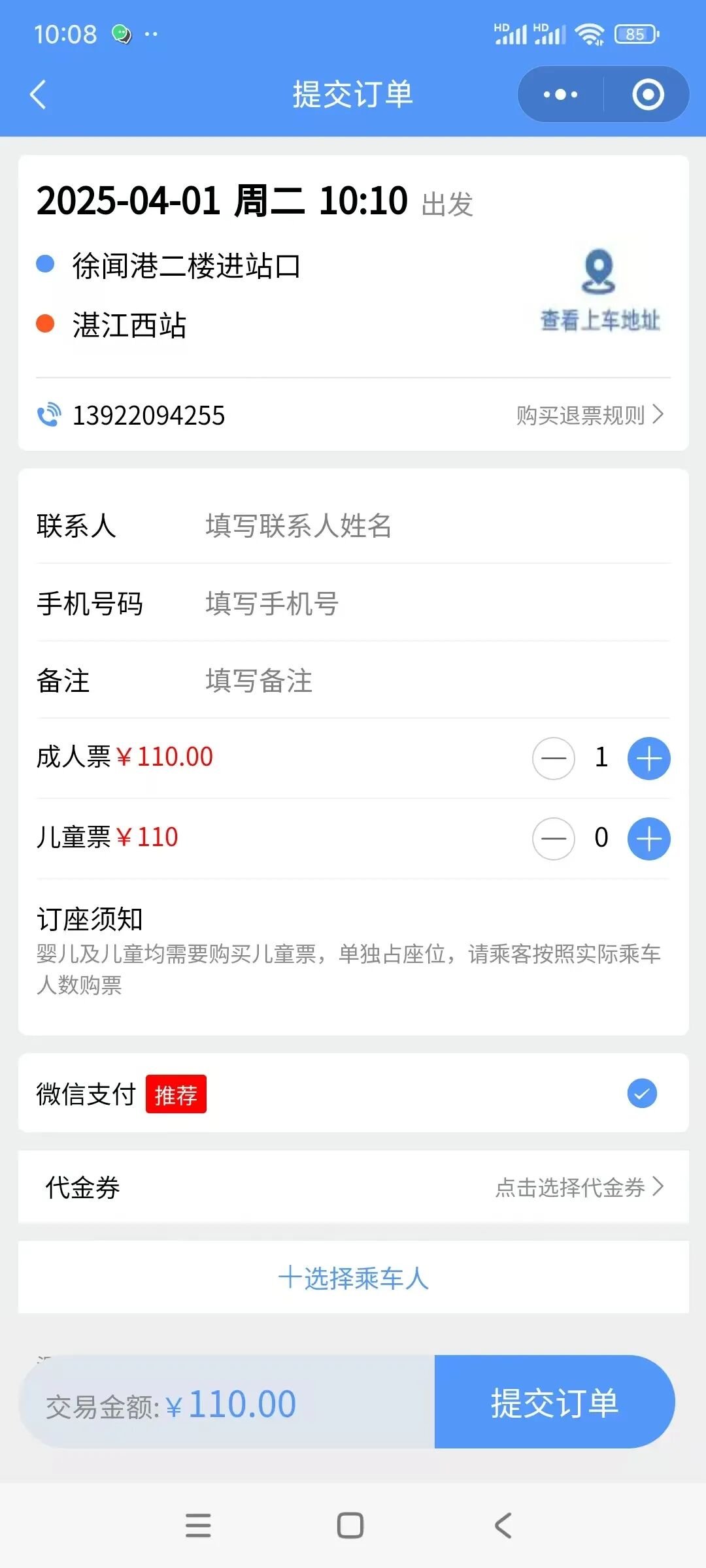 7.填写取票手机号、车辆信息、旅客信息,点击“提交”。