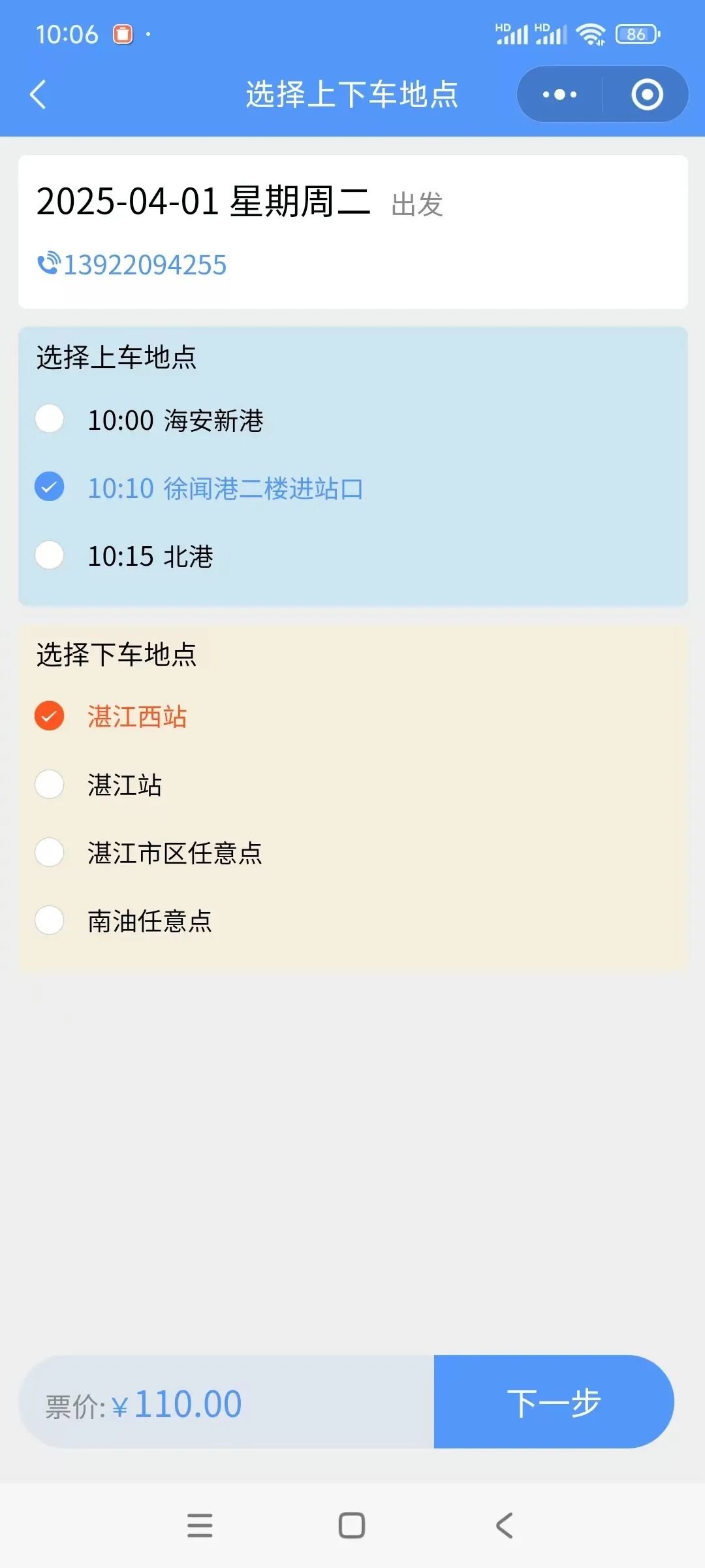点击“购票服务”→选择【湛海出行】→选择常用路线→选适合的出行时间段→选择出发与目的地→添加联系电话与乘车人→下单支付。