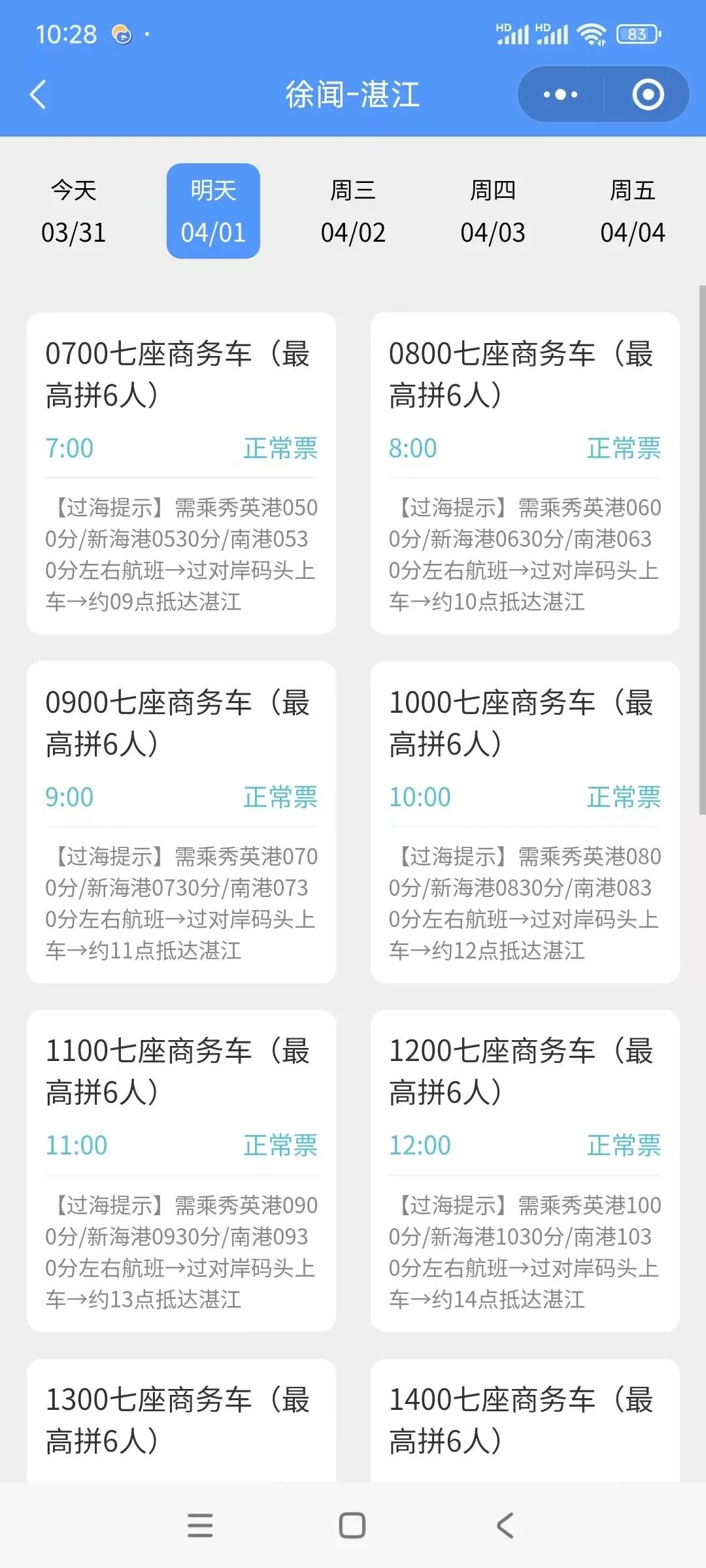建议您在前往湛江的列车上,即可通过“徐闻港”微信服务号,根据您的实际抵站时间,提前预订“商务车接站+船票”联程套票。