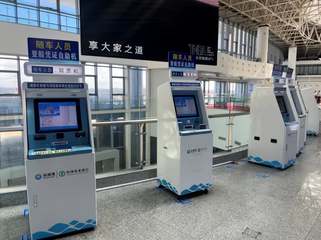 车辆到达人车分离处,随车人员需下车带上自己的身份证到交通枢纽二楼的自助取票机取登船小票。司机带着车票进入安检候渡。