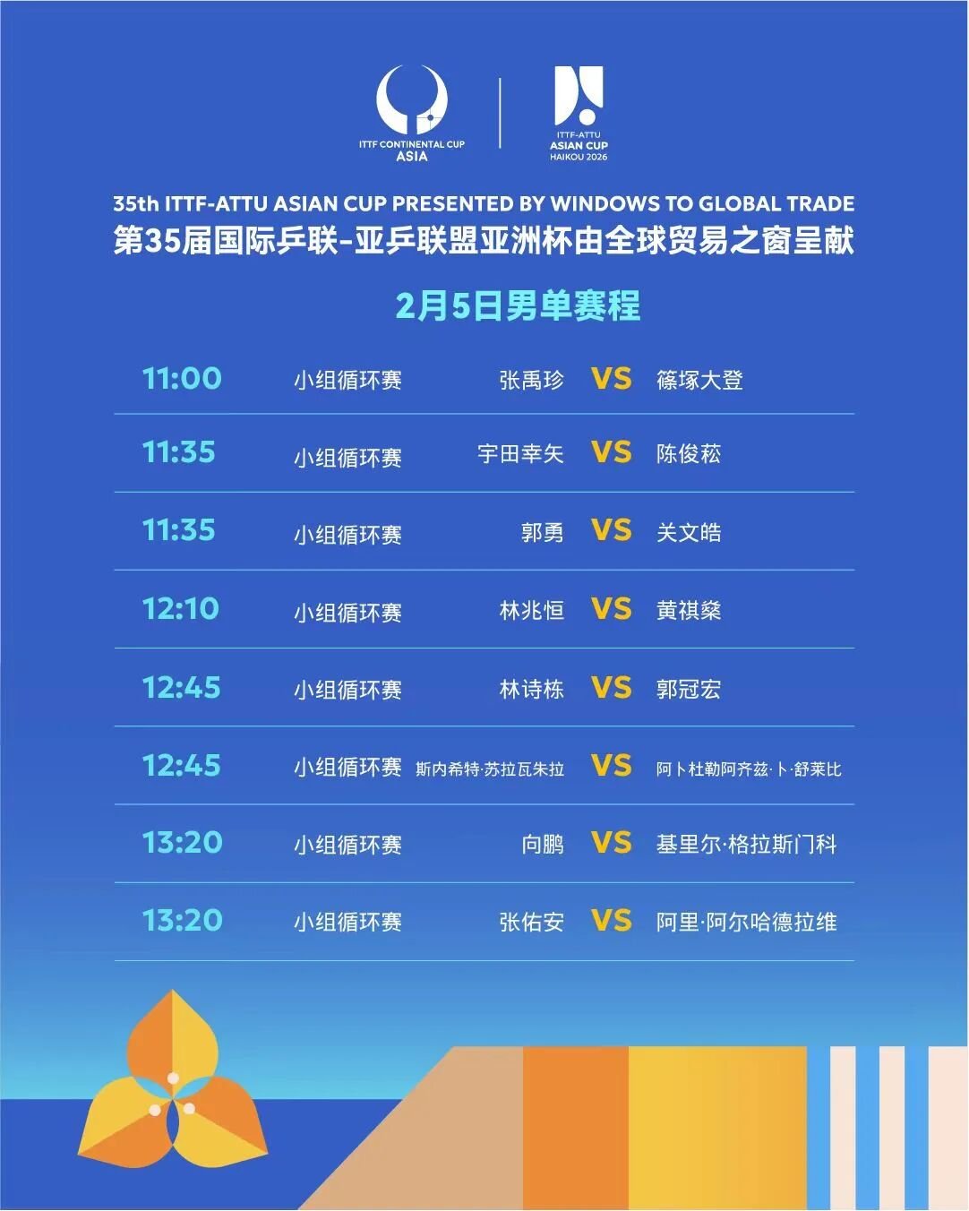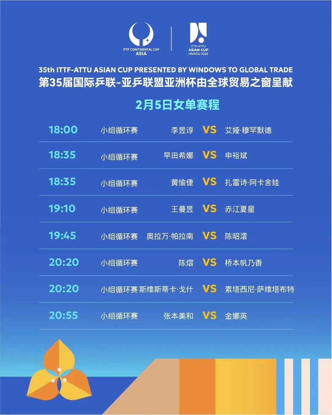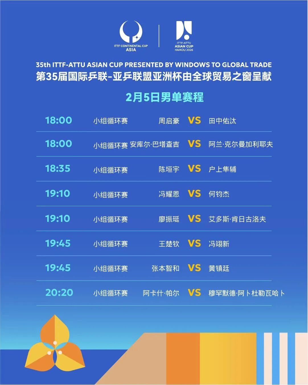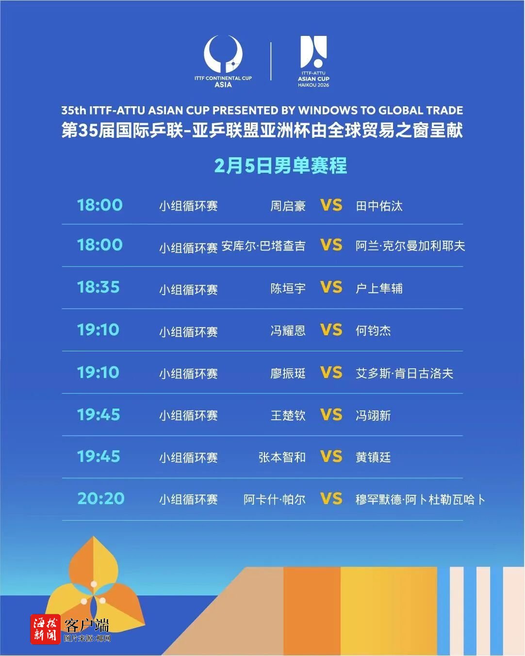商报全媒体讯(椰网/海拔新闻记者 王辉)2月5日,第35届国际乒联-亚乒联盟亚洲杯将在海口五源河体育馆进行小组赛第二轮比赛,孙颖莎、王楚钦、王曼昱、林诗栋等人将出战。