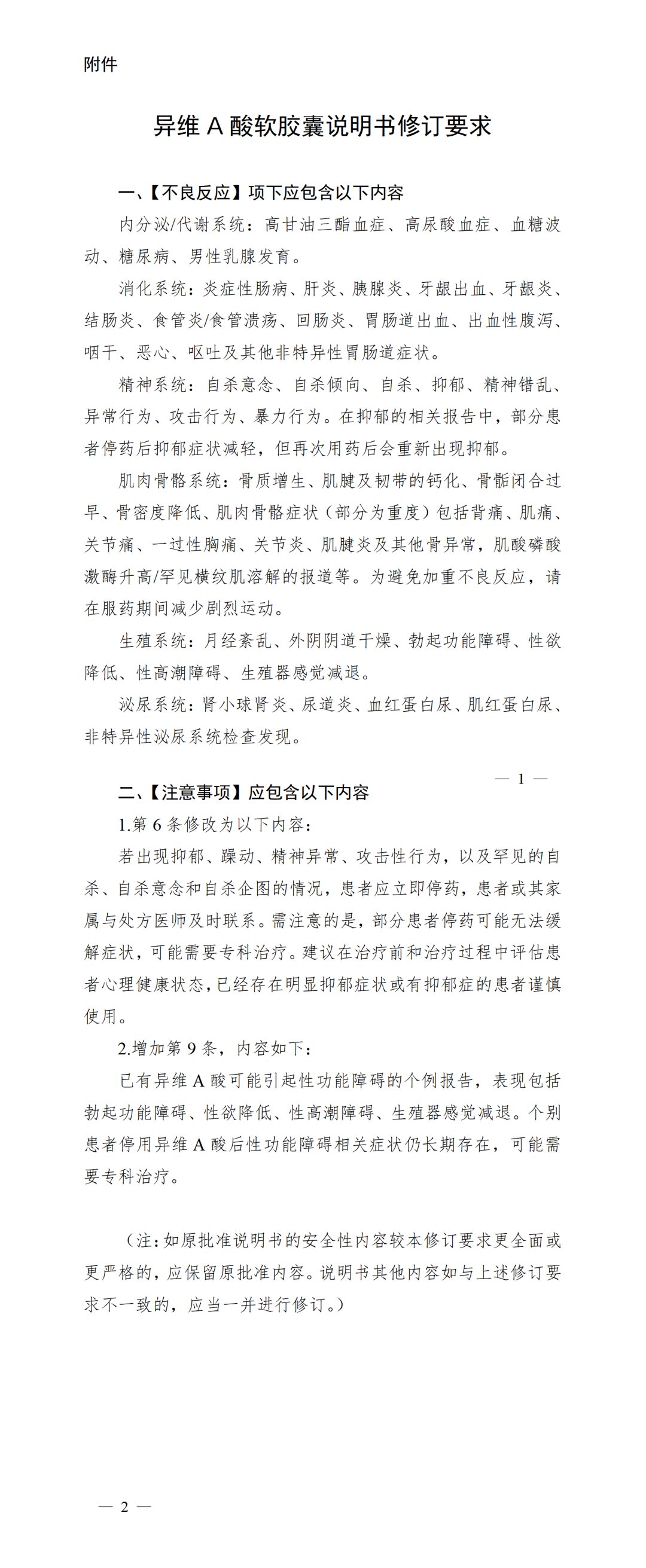最新发布的《异维A酸软胶囊说明书修订要求》明确其不良反应项应包含内分泌、消化、精神、生殖等数十项副作用提示,并修改与新增了两条注意事项: