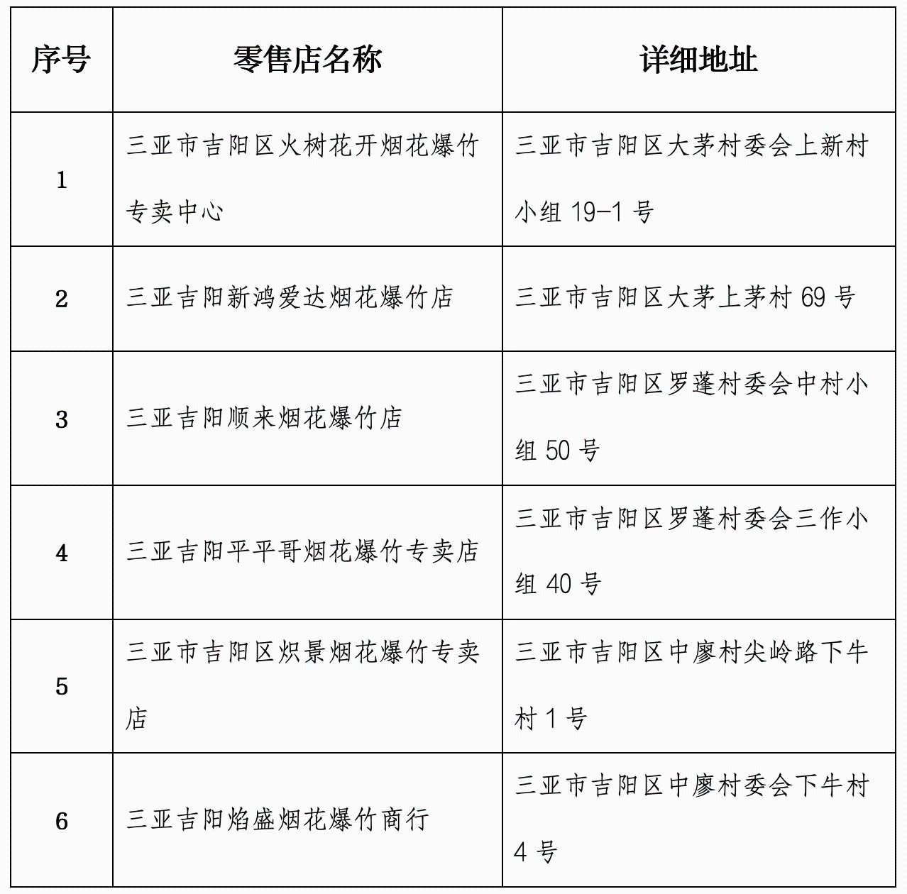 三亚吉阳区公布6家合法烟花爆竹零售点
