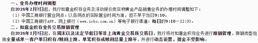 另外,部分银行于近期调整黄金相关规则。其中工商银行自2026年2月7日起,在周末以及法定节假日等非上海黄金交易所交易日,将对如意金积存业务进行限额管理,限额类型包括全量或单一客户单日积存/赎回上限、单笔积存或赎回总量上限等,并进行动态设置,提金不受影响。