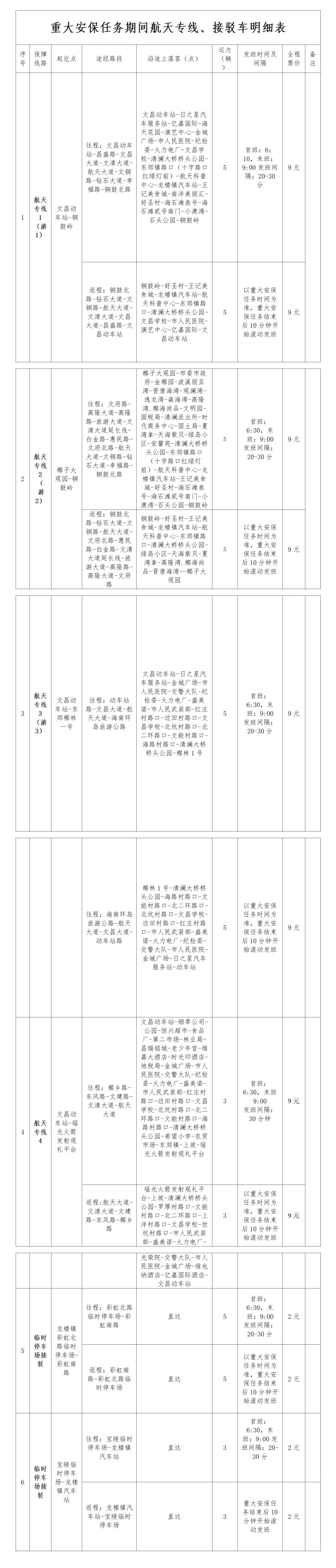 为确保重大安保任务期间文昌市龙楼镇道路交通安全畅通,有效缓解交通压力,文昌市交通运输局分别在文昌动车站、椰子大观园开通四条航天专线,所有专线全程票价9元。如需前往的游客和市民可在各点位乘坐专线车抵达对应点位,返程上车点即为往程下车点。