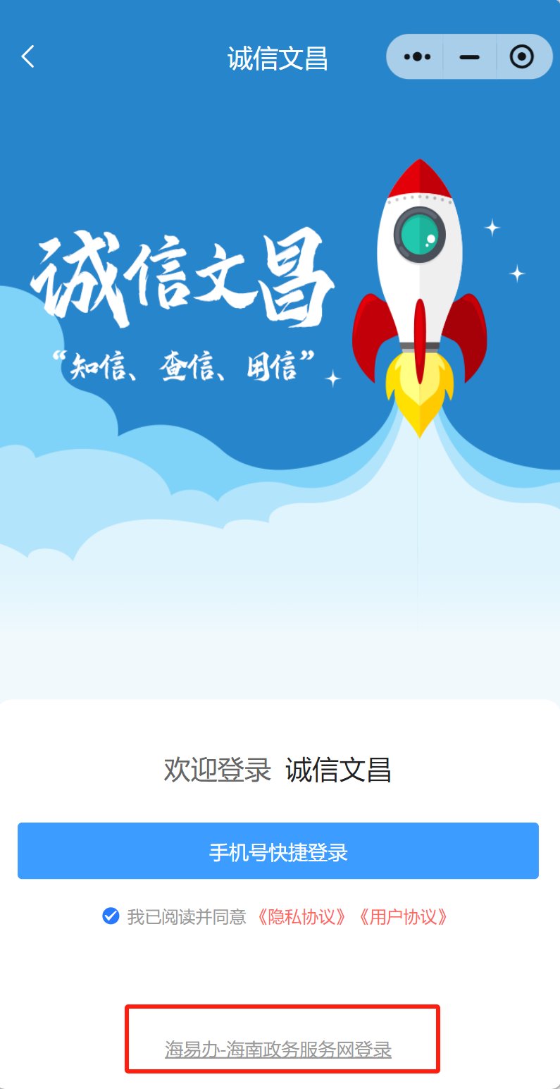 3.如微信绑定手机号尚未在海易办注册,点击页面下方“海易办—海南政务服务网登录”按钮,保存二维码图片,使用微信/支付宝/海易办APP扫码完成授权注册后,返回“诚信文昌”小程序,按照上述流程进行手机号快捷登录。