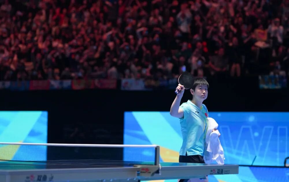 2月8日,孙颖莎在比赛结束后向观众致意(资料图)。新华社发