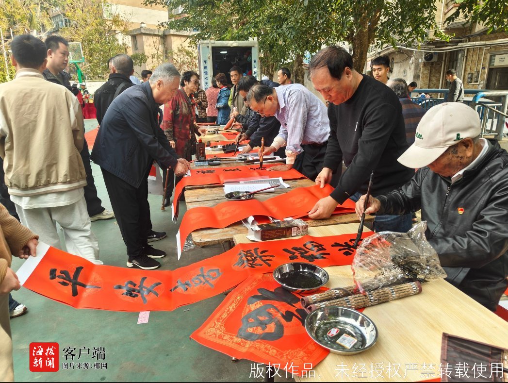 商报全媒体讯(椰网/海拔新闻记者 徐明锋 摄影报道)2月9日下午,海口市美兰区人民街道拦海社区冼太夫人庙门前人头攒动,一场以“福运加‘马’过大年”为主题的2026年新时代文明实践“美兰实践派 宣传‘大篷车’”暨“我们的节日·春节”主题活动火热开展。作为活动的重要组成部分,海口市二手车鉴定评估行业协会组织13名书法家现场挥毫,为居民免费书写200余副春联及100多个“福”字,以传统笔墨传递新春祝福,为即将到来的丙午马年增添了浓浓年味。